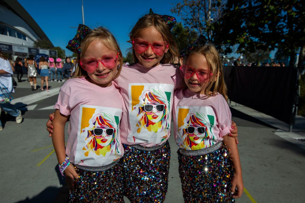 Taylor Swift fans Ashleigh Shoemaker, 7, left; Ava Wulfmeyer, 7, middle; and Madi Boehm, 7, right, of Coto de Caza, California, are all smiles as they arrive to SoFi Stadium in Inglewood. (Francine Orr via Getty Images)