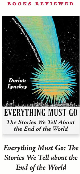 Dorian Lynskey’s Everything Must Go: The Stories We Tell about the End of the World is an exhaustive look at the enduring appeal of works about how civilization might end, from the Book of Revelation to 12 Monkeys, The Matrix, I Am Legend, and whatever extinction-level event Hollywood next brings to screens. (“Extinction-level event,” by the way, is a phrase popularized by the 1998 blockbuster Deep Impact, starring Robert Duvall and Téa Leoni, about what happens as Earth prepares to receive an asteroid the size of Texas.)