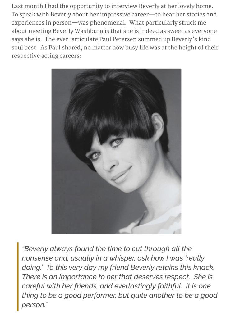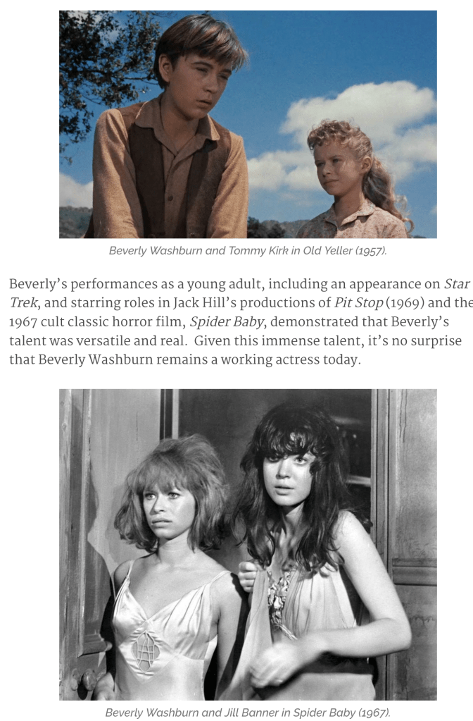 She would go on to appear on all the big shows of the 1950s and 60s in episodes of “Dragnet,” “Gidget,” “Father Knows Best,” Wagon Train” “The Loretta Young Show,” “Leave It to Beaver,” “The Streets of San Francisco,” and many others which she recounts in her book, “Reel Tears: The Beverly Washburn Story” and “Reel Tears, Take Two.”