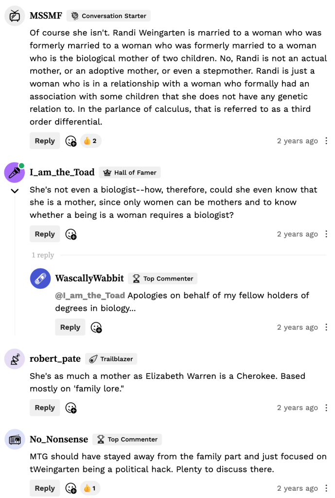 Back to the family history, which helps shed light on why Greene said what she said: Weingarten was friends with Rabbi Sharon Kleinbaum in the 1990s, and they married in 2018. Kleinbaum previously was married to Rabbi Margaret Moers Wenig. They wed in 2008. Wenig had two children with her former husband, whom she divorced upon realizing she was a lesbian; Wenig and her husband shared equal custody of their two daughters. Kleinbaum and Wenig divorced in 2012 after a nearly 20-year relationship. In a New York Times interview published in 1993, Kleinbaum mentioned raising two kids, but did not disclose the ages. A brief biography of Kleinbaum published before 2013 mentions that the two daughters had graduated, and Kleinbaum had a niece and nephew.