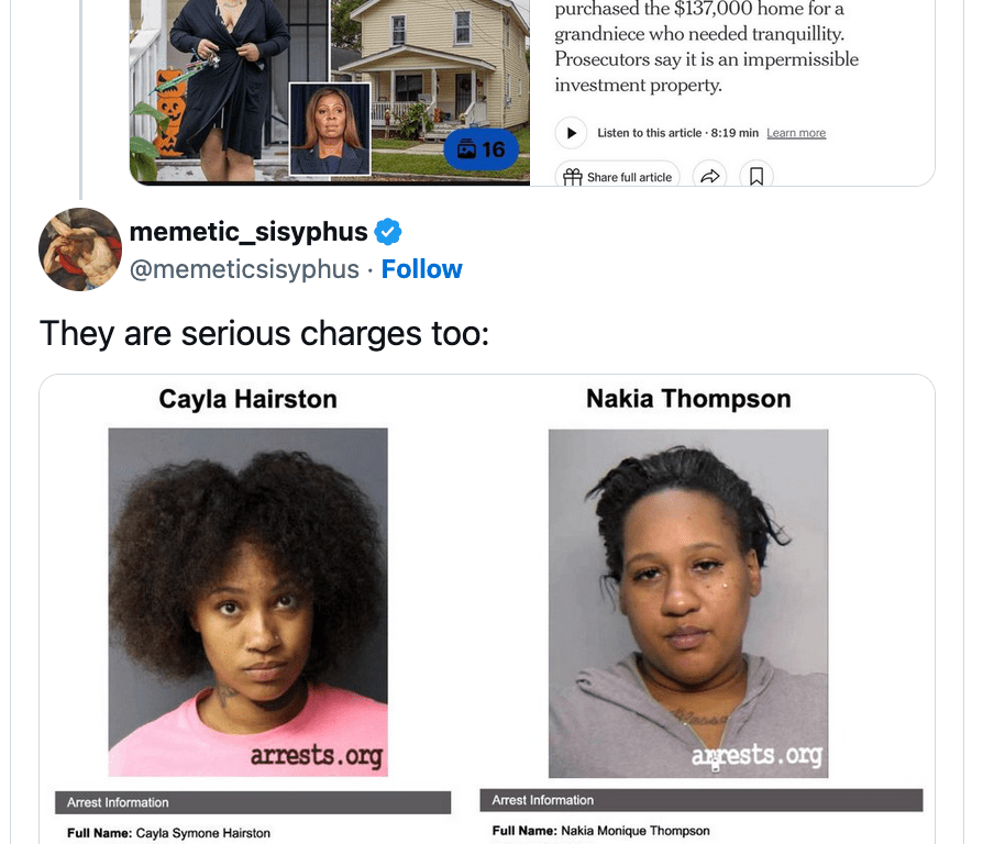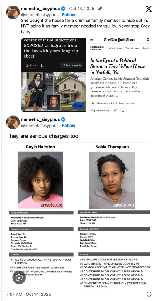 The piece centered on residents of a home James allegedly listed as a primary residence in Norfolk, Virginia, to obtain better loan conditions. The attorney general purchased the home for her grandniece, Nakia Thompson, who was looking for “tranquility” after experiencing tumultuous times in other cities. “Five years ago, the door of a modest yellow house on a quiet stretch of avenue in Norfolk, Va., swung open to admit a young family looking for a peaceful life after years of turbulence in several cities,” The Times reported.
