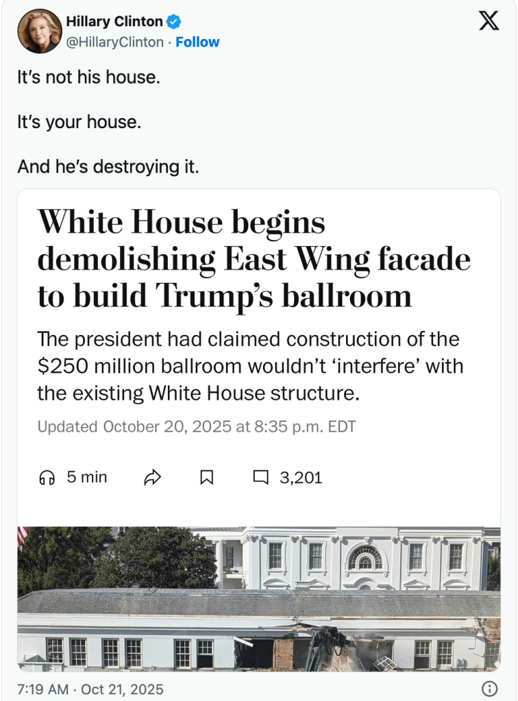 Perhaps one of the worst responses, and one of the most unintentionally hilarious, came from Hillary Clinton, who claimed Trump was “destroying” the White House.