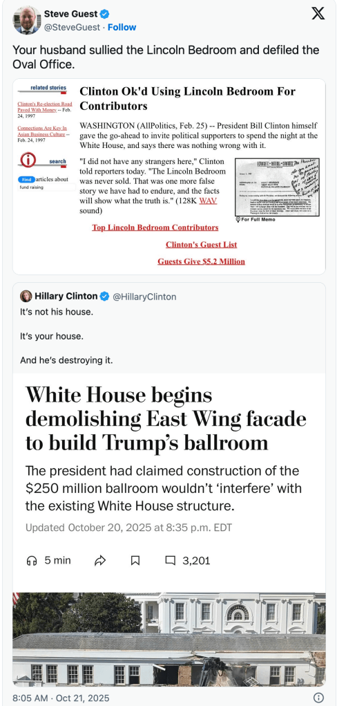 I find it amusing that you hear from Hillary Clinton only after she gauges what the popular leftist position is on a matter. However, she never wants to be challenged or hear what other people say because she always cuts off replies on X. But she, of all people, should not be commenting on the misuse of the White House.