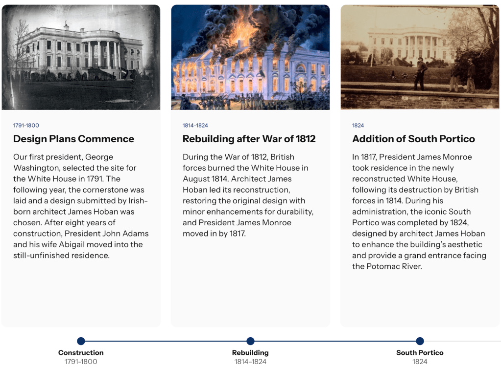 Our first president, George Washington, selected the site for the White House in 1791. The following year, the cornerstone was laid and a design submitted by Irish-born architect James Hoban was chosen. After eight years of construction, President John Adams and his wife Abigail moved into the still-unfinished residence. During the War of 1812, the British set fire to the President’s House, and James Hoban was appointed to rebuild it. James Monroe moved into the building in 1817, and during his administration, the South Portico was constructed. In 1829, Andrew Jackson oversaw the addition of the North Portico. Various proposals were put forward during the late 19th century to significantly expand the President’s House or to build an entirely new residence, but these plans were never realized.