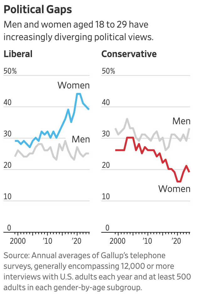 A growing political divide between men and women has compounded the challenges of finding love. Around 39% of women ages 18 to 29 identified as liberal in 2024, according to Gallup, compared with 25% of their male peers. This gap has more than tripled in a decade: 32% of women and 28% of men called themselves liberal in 2014.