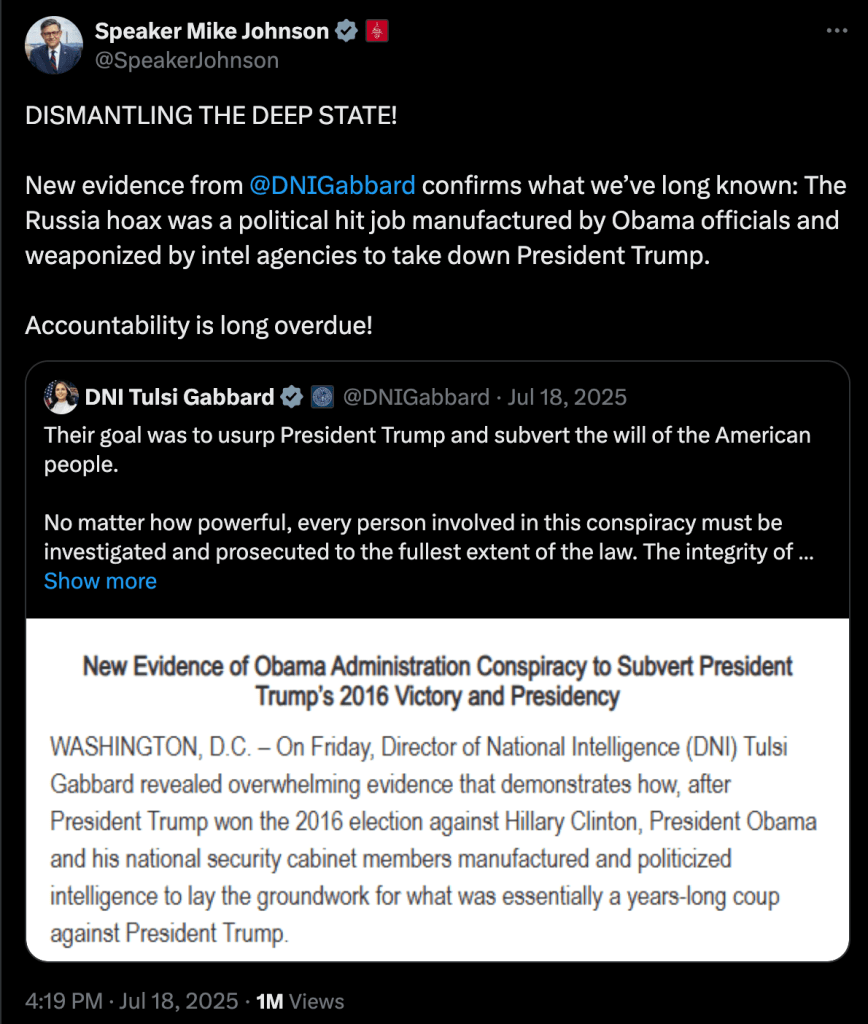 “DISMANTLING THE DEEP STATE! New evidence from @DNIGabbard confirms what we’ve long known: The Russia hoax was a political hit job manufactured by Obama officials and weaponized by intel agencies to take down President Trump,” Johnson declared. “Accountability is long overdue!” he added.