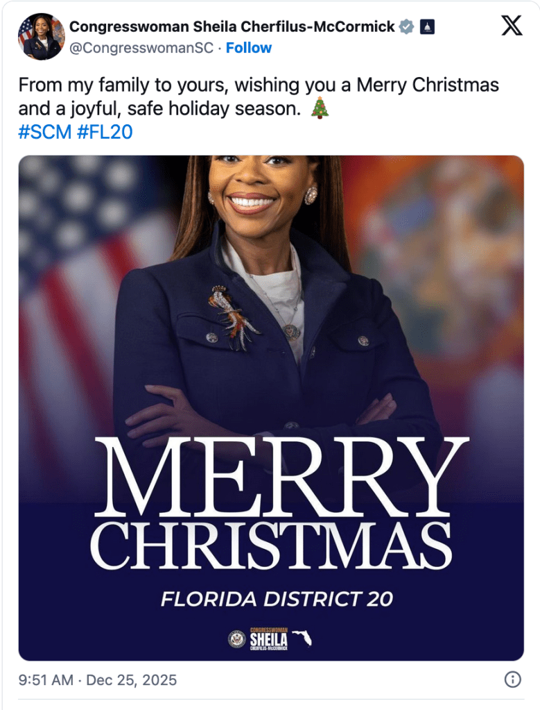 Democrat Rep. Sheila Cherfilus-McCormick (FL-20) sparked controversy on social media Christmas morning for posting an altered photo disguising her alleged fraud.