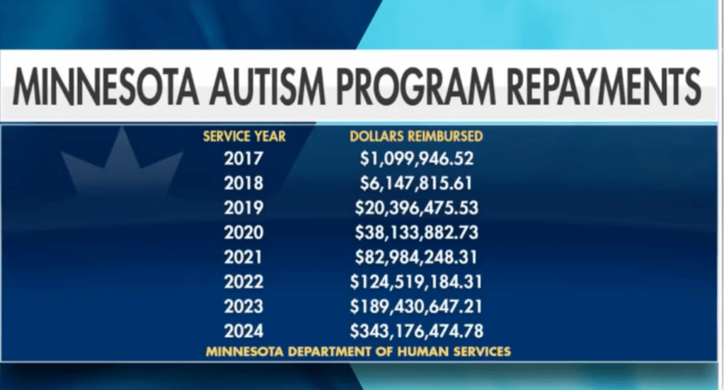 My cmnt: Greg Gutfeld on Feb. 27, 2026 did a segment on WTF is wrong with Minnesota! Here is a chart of government (i.e., taxpayers) spending on autism in Minnesota. Most of it going to Somali pirates living there (thx to the dems).