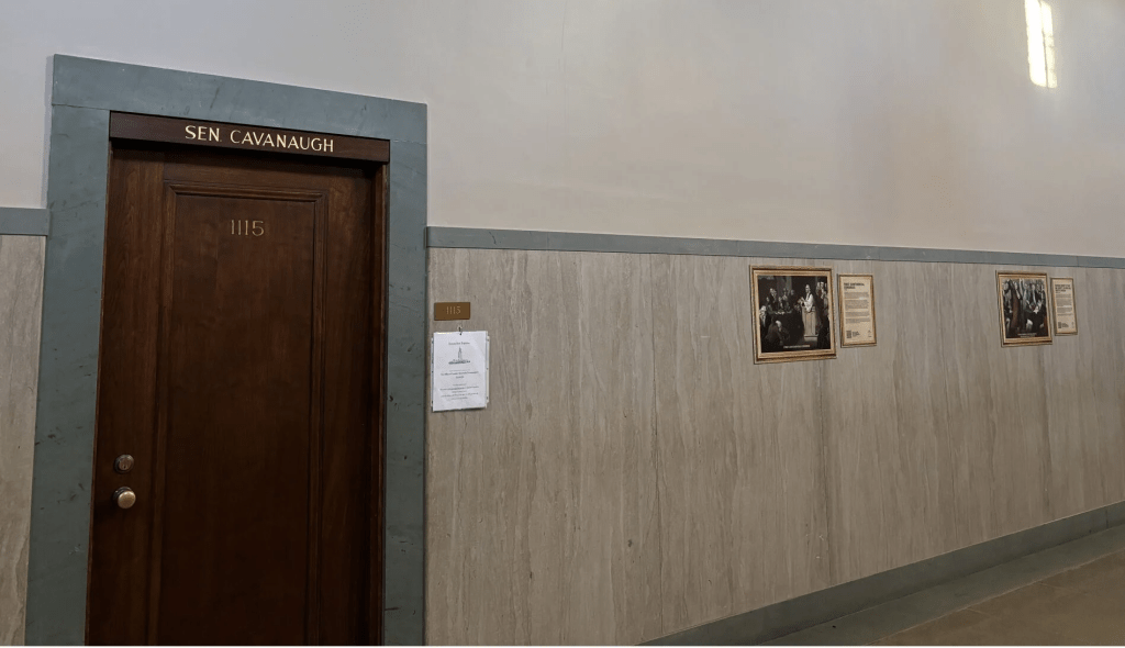Cavanaugh alleged the rules and regulations governing the Capitol building and grounds prohibit senators from posting signs or other items on the walls outside of their offices.