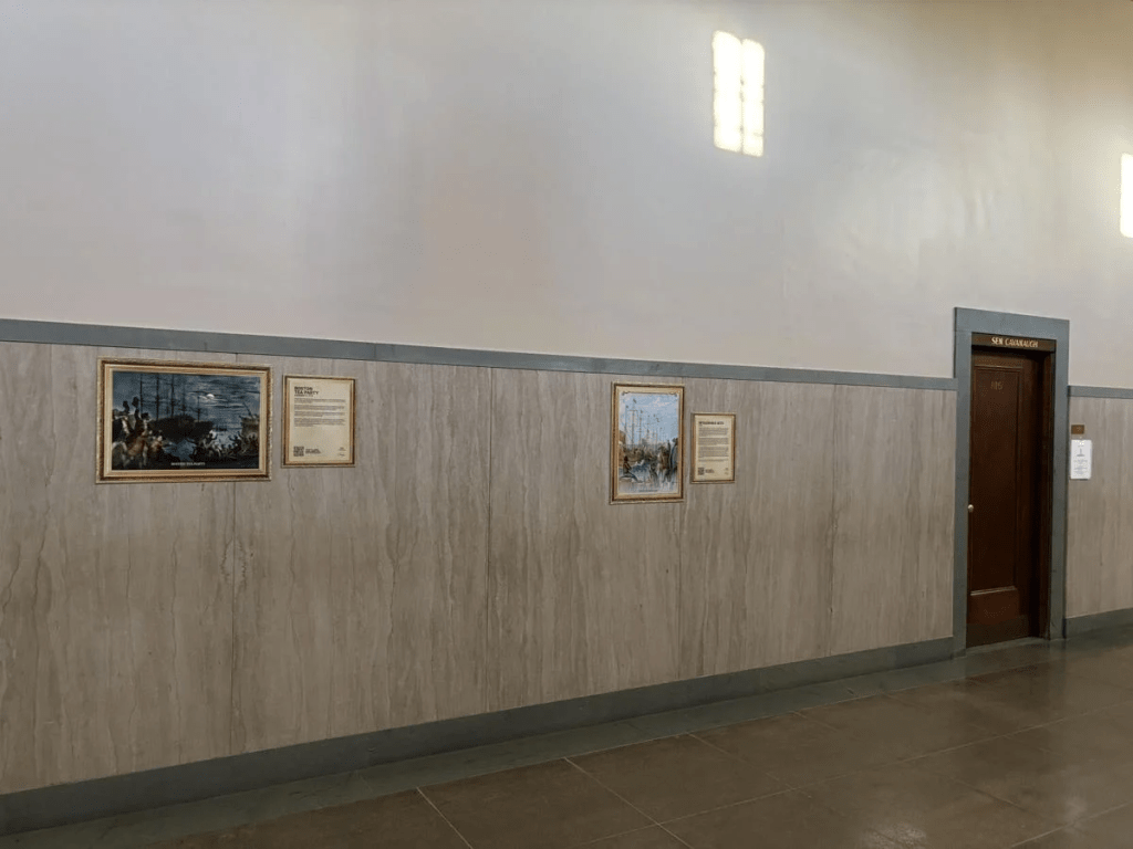 The display, titled “The Road to Liberty,” features 80 portraits of signatories of the Declaration of Independence and other prominent men and women during the Revolutionary War.