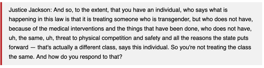 My colleague Ward Clark reported earlier on the SCOTUS trans athletes case and some of the bizarre word salad offered up there by Supreme Court Justice Ketanji Brown Jackson.