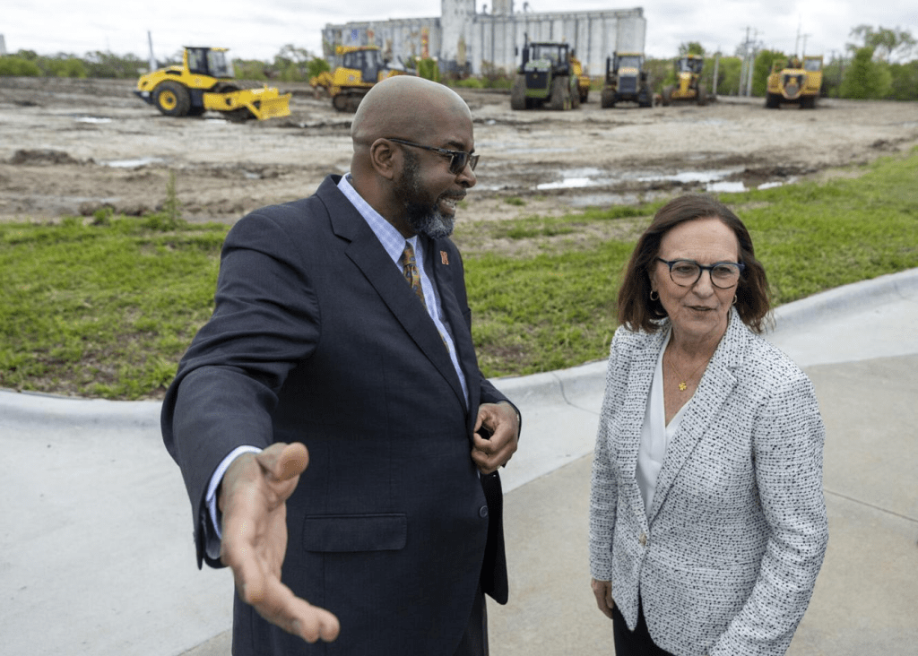 University of Nebraska-Lincoln Chancellor Rodney Bennett and U.S. Sen. Deb Fischer share a conversation in front of the future site of the National Center for Resilient and Regenerative Precision Agriculture after a groundbreaking ceremony Monday at Nebraska Innovation Campus.JUSTIN WAN, Journal Star