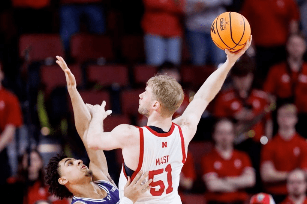 Nebraska’s Rienk Mast (51) goes up for a shot against Northwestern’s Tre Singleton (8) during the first half of a college men’s basketball game at Pinnacle Bank Arena in Lincoln, on Saturday, Feb. 14, 2026. NIKOS FRAZIER, THE WORLD-HERALD