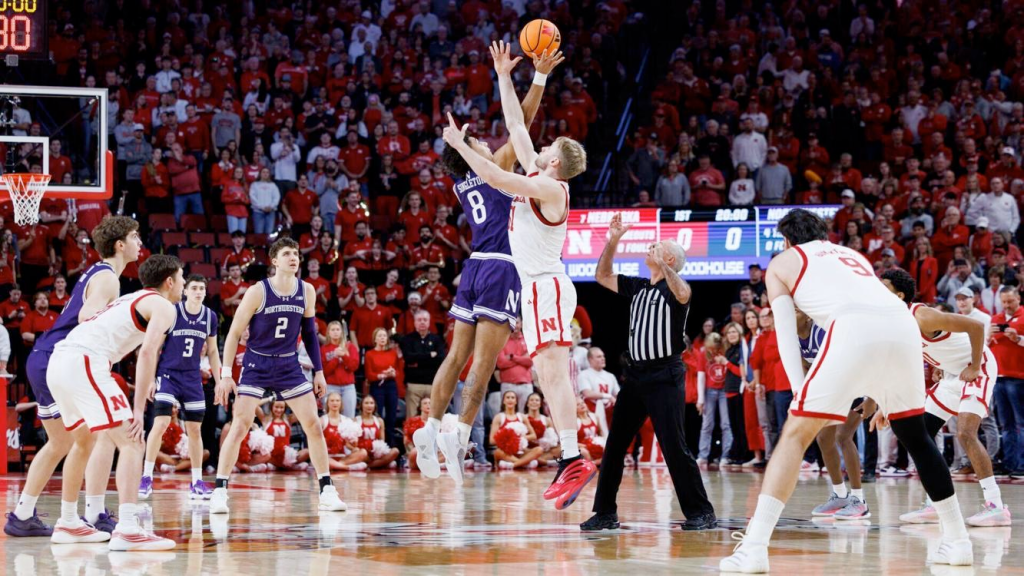 Northwestern’s Tre Singleton (8) and Nebraska’s Rienk Mast (51) go up for the tipoff during the first half of a college men’s basketball game at Pinnacle Bank Arena in Lincoln, on Saturday, Feb. 14, 2026. NIKOS FRAZIER, THE WORLD-HERALD