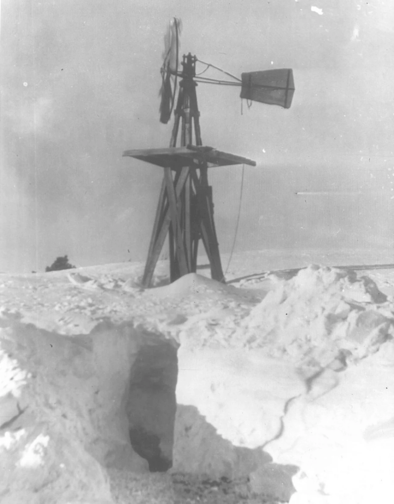 As part of rescue and relief efforts carried out by the Red Cross, a tunnel was dug to the pump houses of this windmill as snow drifts of about 30 feet enveloped the area. Journal Star file photo