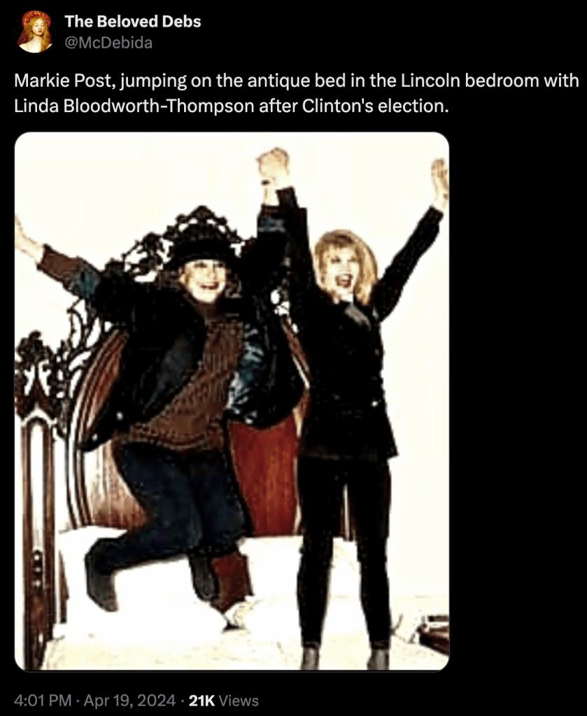 For seven months I have kept on my desk a picture from a tabloid. It is of two close friends of President Clinton, Linda Bloodworth-Thomason and the actress Markie Post. They are laughing and holding hands in joyous union as they jump up and down at where fate has put them down. It had put them in the Lincoln bedroom. They were jumping up and down on Lincoln’s bed.